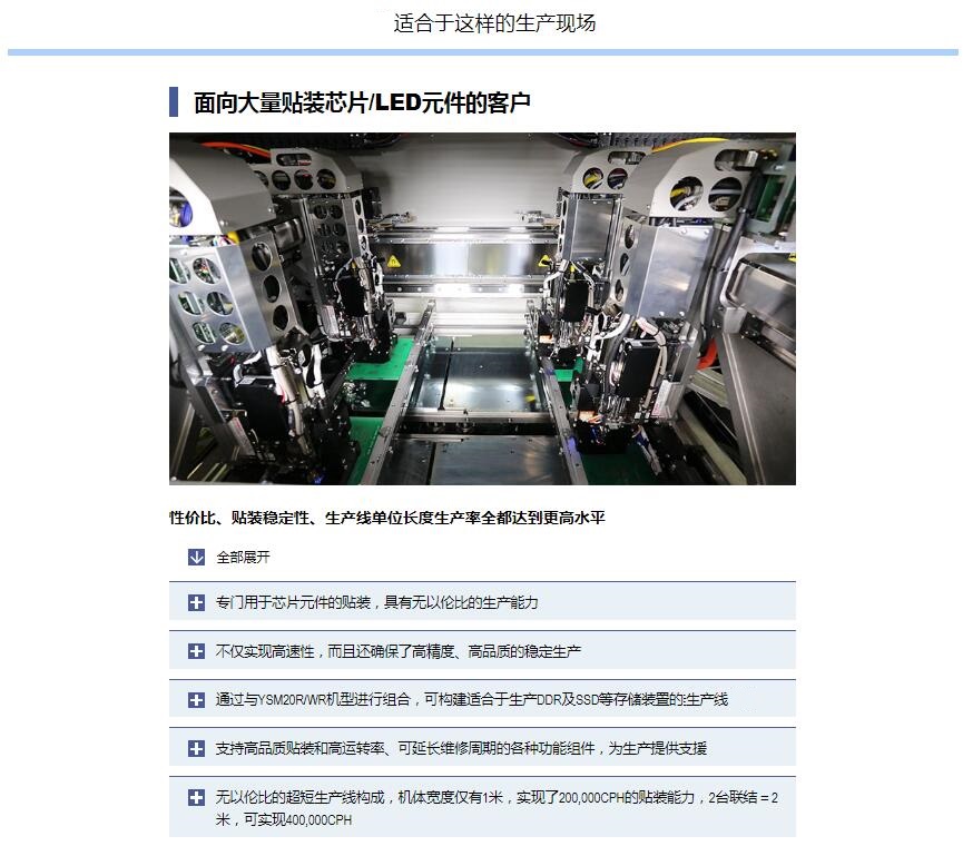 Z:TA-R YSM40R超高速模塊貼片機(jī) 1.采用小巧的平臺構(gòu)造,達(dá)成了世界更高水平的貼裝速度20萬CPH※,實(shí)現(xiàn)了生產(chǎn)率的全面革新。2.全球更高生產(chǎn)率。3.靈活支持多種生產(chǎn)形態(tài)。4.支持高品質(zhì)貼裝和高運(yùn)轉(zhuǎn)率的技術(shù)?!号c4橫梁/4貼裝頭的同級別貼片機(jī)在更佳條件下的貼裝能力(CPH)對比?;?016年4月本公司的調(diào)查結(jié)果。