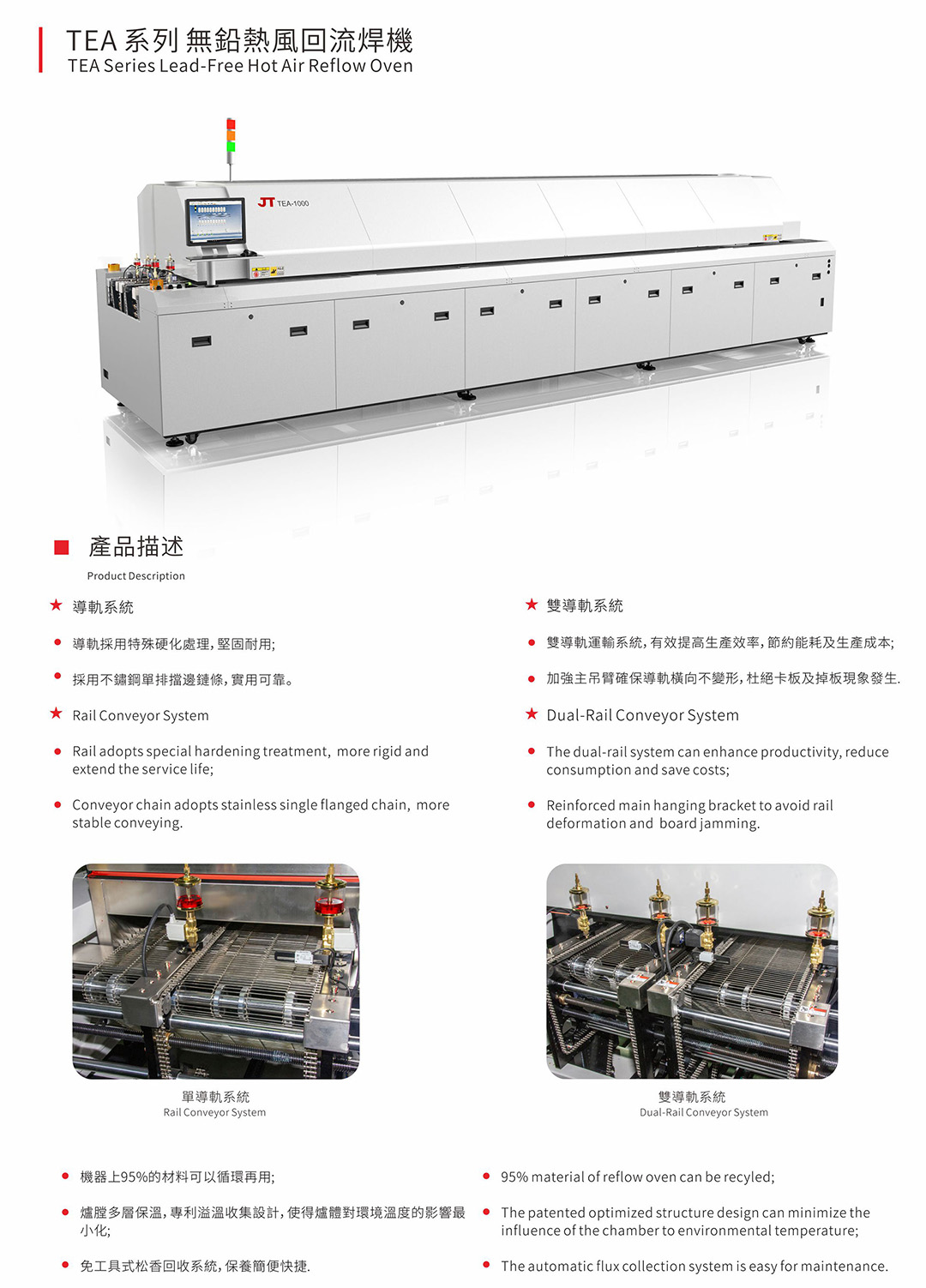 完全滿足各種無鉛焊接工藝要求。Windows7 操作系統,中英文界面,操作簡單易學。標準上8下8空氣爐,專利熱風管理系統使熱風對流傳導更高效熱捕捉更快。PLC十PID閉環控制,性能穩定可靠,溫度控制及曲線重復精度高。雙溫度傳感器,雙安全控制模式,速度異常報警,掉板報警。全模塊化設計,維護保養方便快捷,減少維護時間及成本…