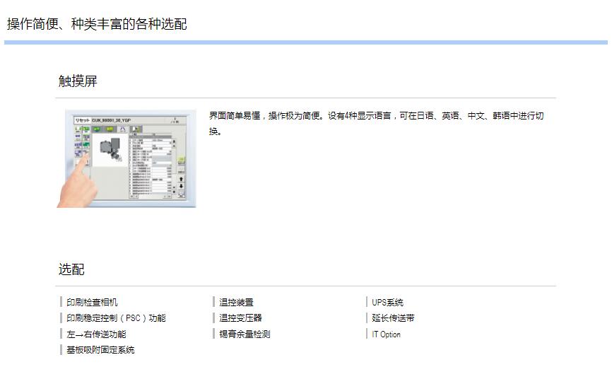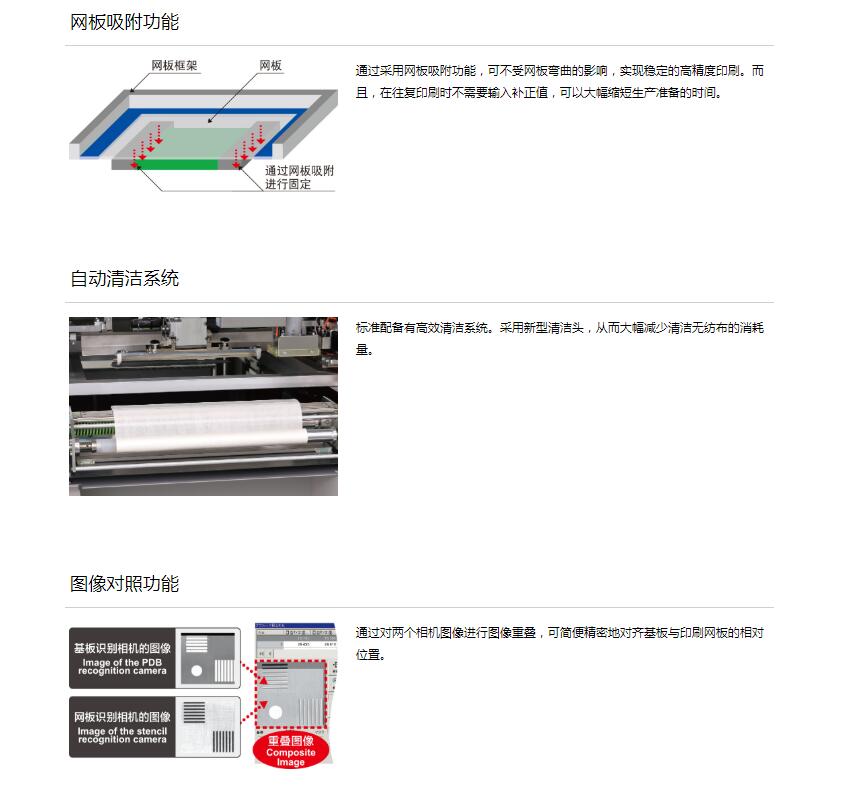 YSP10 高端印刷機1.印刷節拍時間達到世界更快水平,實現全自動化生產作業。2.超高速印刷性能 包括網板清潔作業:12sec/cycle / 10sec/cycle3.重復定位精度:6σ : ±0.01mm4.支持大型基板:L510 x W510mm [選購品: L650 x W510mm]5.網板尺寸:MAX.750×750mm